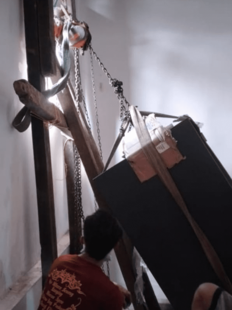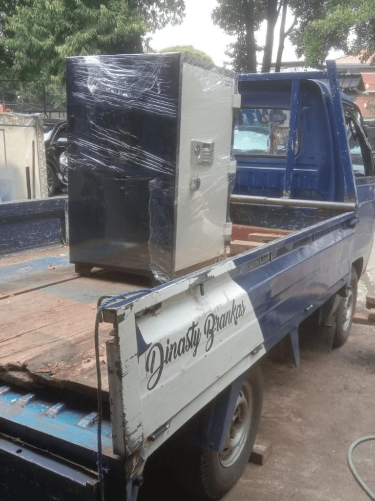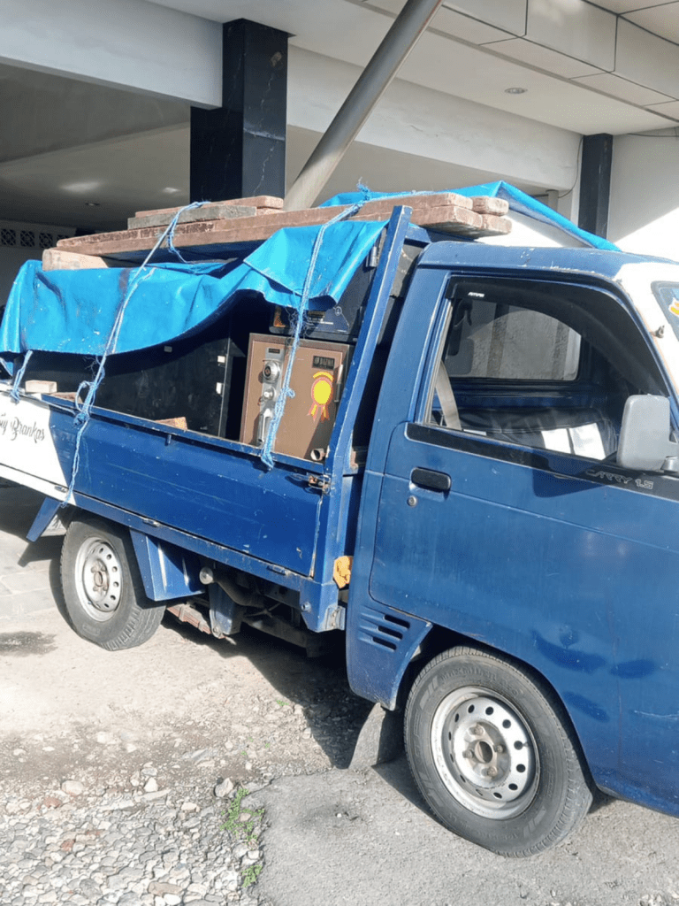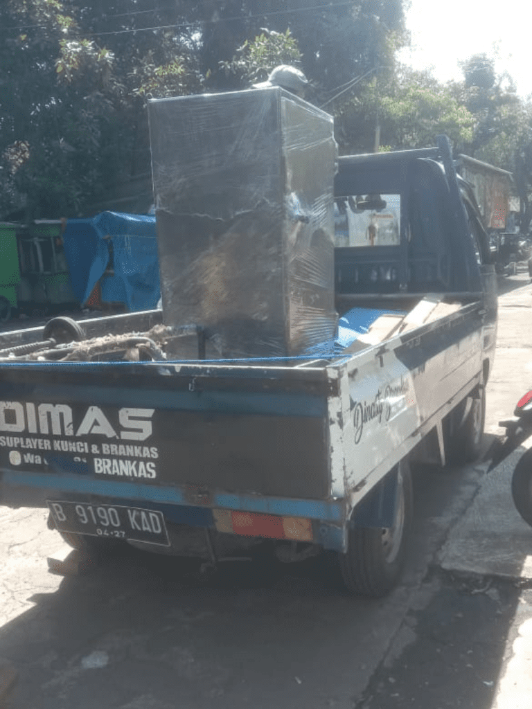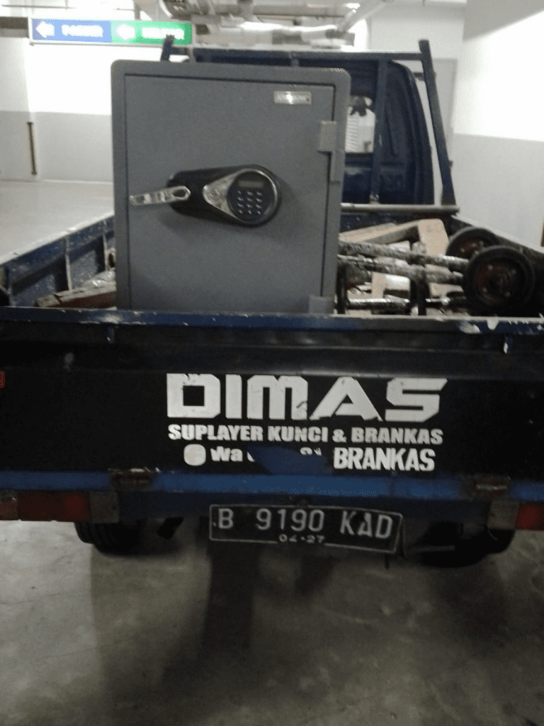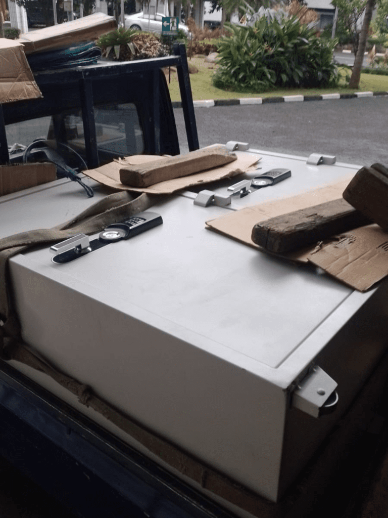 Kami menggunakan alat angkut dan pengaman khusus agar brankas tidak rusak saat dipindah.